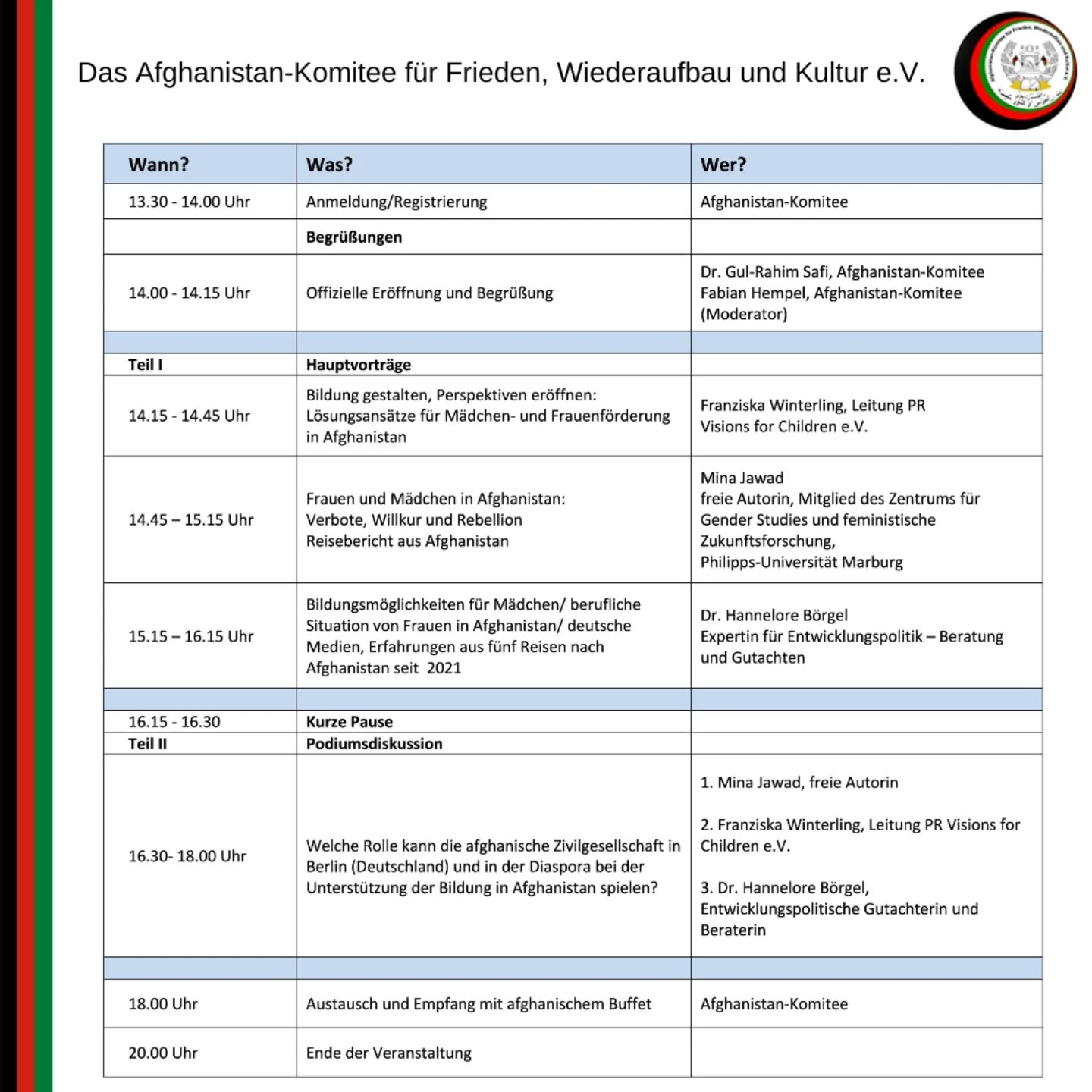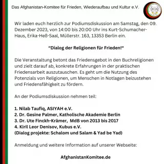 Das Afghanistan-Komitee für Frieden, Wiederaufbau und Kultur e.V. wurde 1996 in München von Afghanen gegründet mit der Motivation, Integration von in Deutschland lebenden Afghan*innen zu unterstützen, gleichzeitig den neuen Generationen die Muttersprache bei zu bringen. Auch verfolgt der Verein das Ziel, den Frieden und Wiederaufbau in Afghanistan zu voranzutreiben. Seit 2011 befindet sich der Sitz des Vereins in Berlin. Das Afghanistan-Komitee ist Mitbegründer und im Vorstand des Dachverbands Afghanischer Organisationen in Deutschland (vafo.ngo), um das Engagement aus Deutschland für Afghanistan zu bündeln und somit gezielt gemeinsam Afghanistan zu unterstützen.